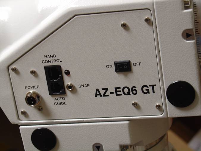 Die Anschlüsse der AZ-EQ6: Die Stecker der Spannungsversorgung (11V bis 16V ist die zulässige Spannung, bis zu 4A "saugt" die Montierung) sollte vorsichtig eingesetzt werden, um die zwei dünnen Kontaktstifte nicht zu verbiegen. Eine Nase verhindert falsches Einsetzen. Der Stecker wird durch eine Überwurfmutter gesichert, so kann keine Unterbrechung durch unbeabsichtigtes Herausziehen des Steckers entstehen. Die Handsteuerbox hat einen RJ12 Westernstecker Anschluss so wie der Autoguider. Über den Snap Port kann eine Kamera Aufnahmesequenz angesteuert werden (Kabel für die Ansteuerung der Canon EOS DSLR Serie ist im Lieferumfang enthalten, für andere DSLR extra erhältlich). Der On-Off Schalter ist wohl klar. Die Power LED dient außerdem als Indikator für Unterspannung. Was man hier noch sieht: Der generelle Aufbau der Montierung mit Lage der Schneckenräder und Schnecken ist gleich wie bei der NEQ6 Pro