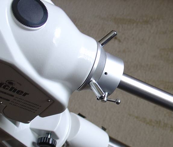 Hier ein Blick auf die Dec Achsklemme (Sterngriff) und die Gegengewichtsstange sowie deren Klemmung. Man sieht, die Gegengewichtsstange ist nun deutlich stabiler ausgefallen: 25mm im Durchmesser. Eine Verlängerung für die Gegengewichtsstange ist im Lieferumfang inbegriffen