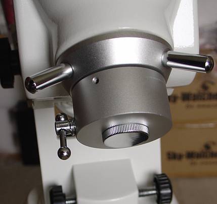 Ein genauerer Blick auf die RA Achsklemme. Hier gibt es platzbedingt keinen Sterngriff sondern nur einen Klemmhebel, der bei Bedarf in eine der nebenliegenden Bohrungen eingeschraubt werden kann. Der Polsucher liegt frei, nur das Okular hat eine Abdeckkappe. Der nicht zu übersehende Hebel dient zur Einstellung der Polhöhe