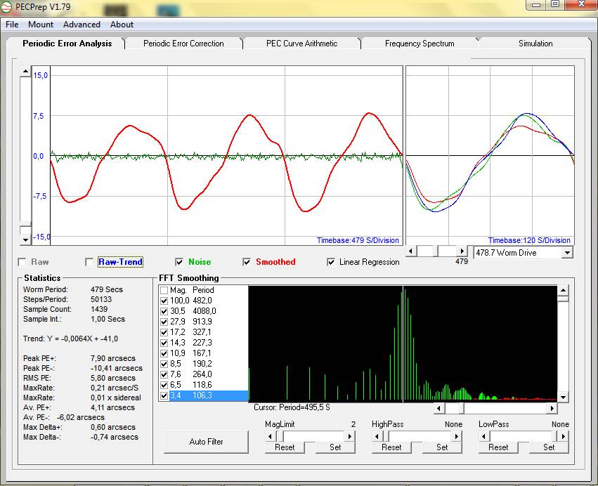Wie bei der normalen EQ6 und jeder mir bislang bekannten Montierung findet man langperiodische Abweichungen. Die sind aber für den Autoguider niemals ein Problem. Was auffällt: Die einzelnen Fehlerkurven pro Schneckenumdrehung sind deutlich "sinusförmiger" und wenn man sie überlagert gibt es auch eine recht gute Überdeckung. Als Noise habe ich hier wirklich nur Seeing raus gefiltert. Auch das Frequenzspektrum (unten rechts) sieht sehr erfreulich aus. Neben der Schneckenperiode sind die anderen Harmonischen sehr niedrig, das erklärt den schönen glatten und nahezu sinusförmigen Verlauf der Fehlerkurve. Die absolute Höhe des Fehlers ist nicht besser als bei einer normalen EQ6, der Verlauf der Fehlerkurve jedoch deutlich schöner.