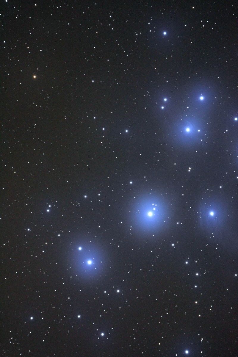 Testfoto: Pleiaden Sternfeld. 102/700 Triplet APO ohne Flattener, Canon EOS 450D nicht astromodifiziert, 7 Minuten bei ISO 1600. Dünne Wolken, leider viel Streulicht, wenig Nebel, aber gutes Guiding