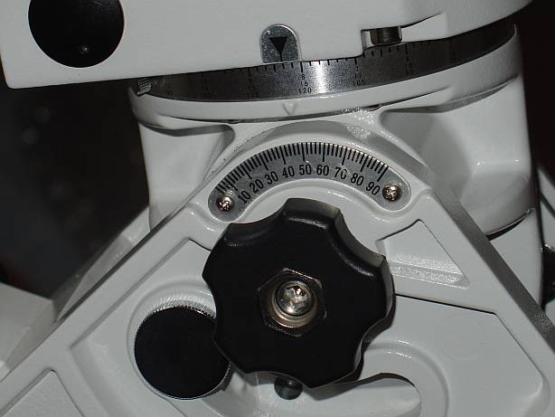 Die Höhenskala am Polblock und die Klemme. Einfach durch schwenken in der Höhe geht nicht. Für den EQ Betrieb kann die Polhöhe von 10° bis 75° eingestellt werden. Für den AZ Betrieb (90°) muss der Bolzen (links unter der Klemme) in das Loch unter der Klemme versetzt werden. Auf der gegenüberliegenden Seite freilich auch.