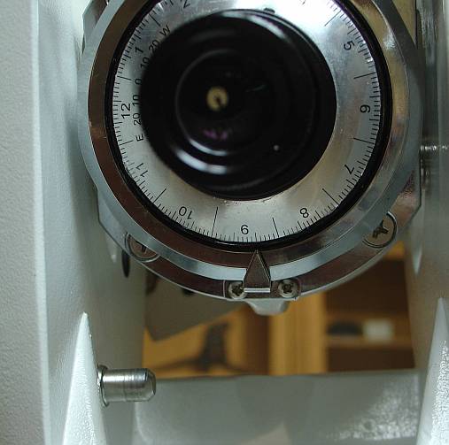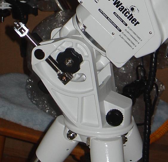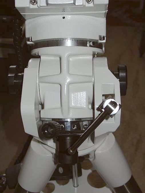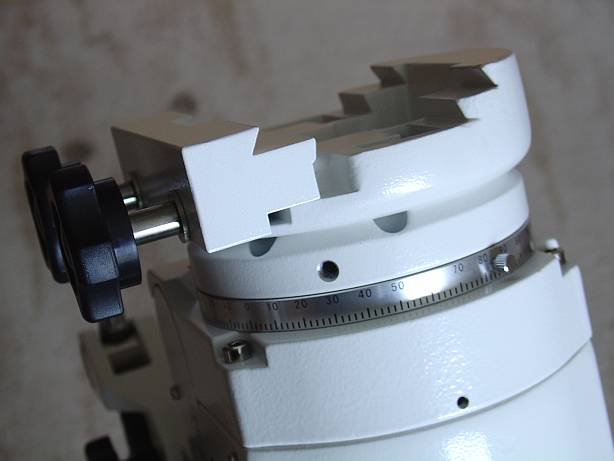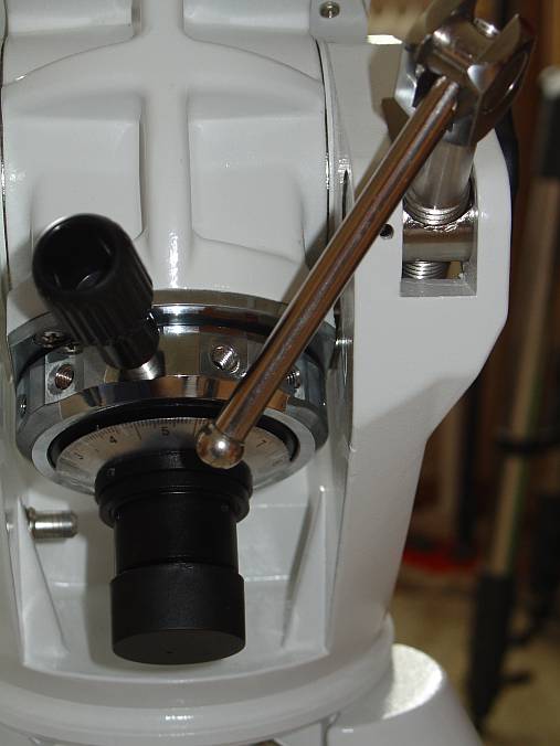 Ein genauerer Blick auf den Polsucher: Der Zeiger zur Einstellung des Datums ist an der Unterseite versteckt. Um den Durchgang des Polsuchers frei zu machen, ist die Dec Achse wie üblich quer zu stellen. Man erkennt hier auch die LED, die den Polsucher beleuchtet
