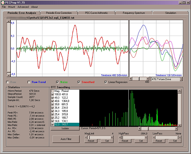 Damit man auch etwas zum Auswerten hat, habe ich via CCDSoft Logs gezogen. Sowohl vom Tracking (unguided), als auch von ersten Guiding Tests. Mit dem Tracking Log geh ich gern einmal in ein Tabellenkalkulationsprogramm rein, und lasse mir ein Diagramm erstellen. Die Dec Abweichungen sollten - speziell bei einem 1-Stern Alignment - die reine Seeing Bandbreite anzeigen. Das ist eine wertvolle Erkenntnis, damit lässt sich in PECPrep der Filter so einstellen, dass diese Bandbreite als Noise rausgefiltert wird. Den Periodischen Fehler - naja, sehr periodisch ist er nicht - habe ich mit maximal etwa 15" ermittelt. Die Amplitude schwankt durch eine langperiodische Fehlerkomponente, und es ist insgesamt ein recht komplexer Kurvenverlauf von Zyklus zu Zyklus, der sich irgendwann wiederholt. Wenn man die PE Kurve aus mehreren Schneckenzyklen anschaut, gelangt man zur nächsten Erkenntnis: Mit PEC - Korrektur seitens der Montierung - wird man kaum glücklich werden, weil eben die Zyklen in Amplitude und Form stark unterschiedlich sind. Man erwischt halt beim PEC Training irgend einen Zyklus... Allenfalls hätte eine PE Korrektur in der Form nach EQMOD einen Sinn: von PECPrep gemittelte PEC Kurven über EQMOD einspielen und via ASCOM Pulse Guiding (z.B. PHD) guiden. Damit würde man den Fehlerwert deutlich runter kriegen, und hätte den Vorteil, erstens mit einer gemittelten und geglätteten Korrekturkurve zu arbeiten, die ihrerseits keine hochfrequenten Spitzen rein bringt, und auch, dass der Autguider nicht mit der PEC zu "kämpfen" beginnt.