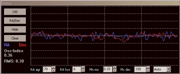 Ganz anders präsentierte sich die Sache in einer Nacht mit ruhigerem Wetter und auch wesentlich besserem Seeing. Ich musste die Parametrierung etwas ändern, um letztlich eine Fehlerbandbreite von maximal +/- 0,4 Pixel, meist weit drunter, zu erhalten. Also RMS über etliche Minuten war der Fehler bei 0.21 Pixel, das sagt auch, dass es relativ wenige "Ausreißer" gab. In Bogensekunden ausgedrückt, war der Fehler maximal +/- 0.8" und meist weit drunter, der RMS Wert ergibt 0.42". Das ist schon recht fein, und es war auch deutlich über die Dec Fehlerbandbreite sichtbar, dass das Seeing brauchbar gut war. Diese Performance, "out-of-the box", ist für ein Massenprodukt schon bemerkenswert.