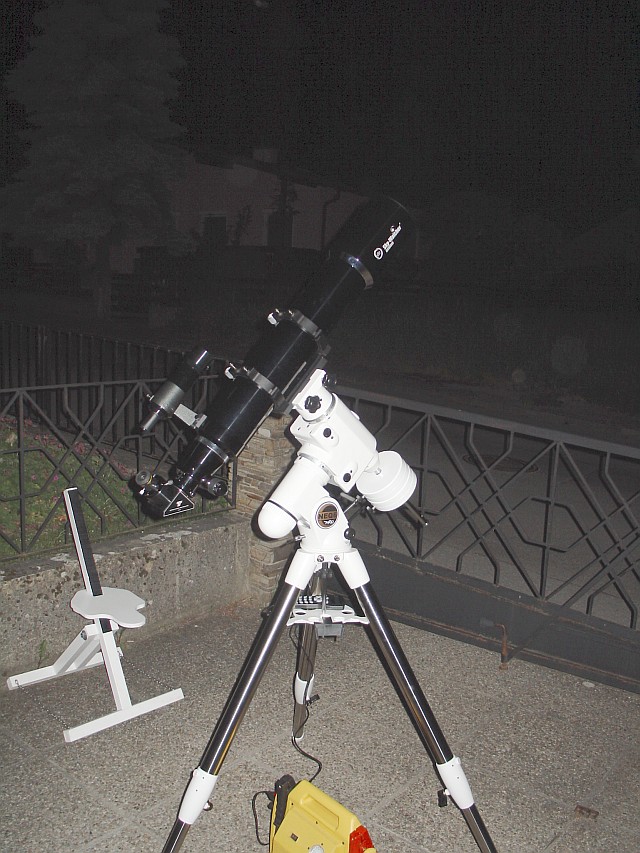 Zum Test war ein Skywatcher Equinox 120/900 ED Refraktor aufgesattelt, und als Autoguider diente meine altehrwürdige SBIG ST-402. Den ersten Eindruck vom Tracking holte ich mir aber dennoch erst einmal visuell, mit einem Fadenkreuzokular. Es geht halt nichts über die eigene Anschauung. Und dabei bin ich zu dem Schluss gekommen, dass man mit 1 Sek. Korrekturintervallen diese Montierung guiden können müsste.