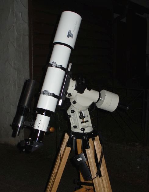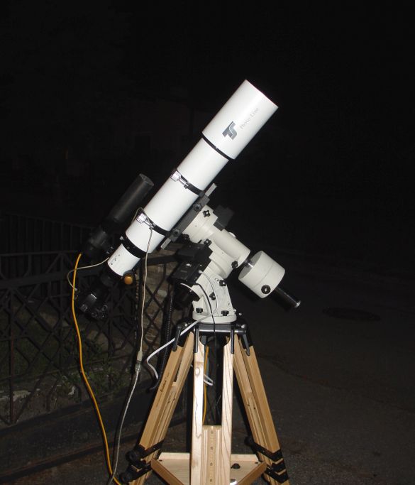 Der 115/800 Triplet APO hier im visuellen Test, auf meiner iOptron ieq45, die auf einem Berlebach Planet Stativ sitzt. Als Sucher ist mein 8x50 Exemplar drauf, den ich auch als Leitrohr für die Guider Kamera verwende