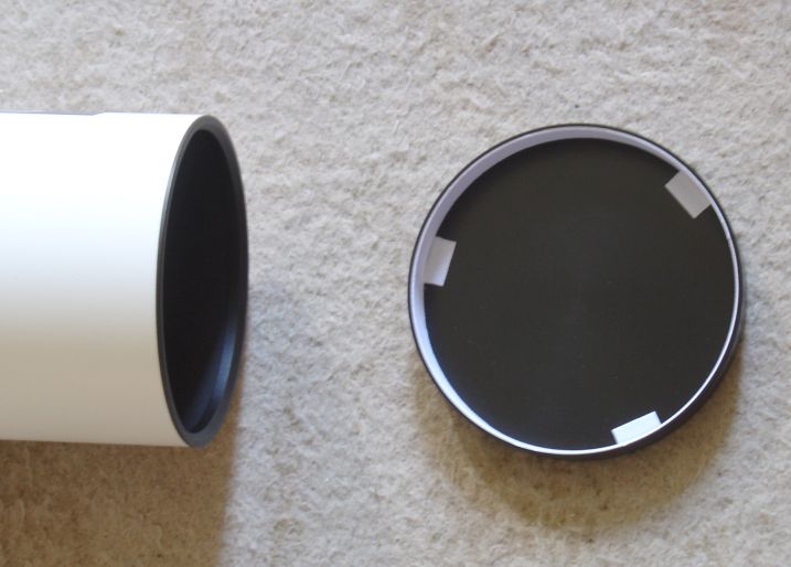 Nimmt man den Refraktor heraus und holt ihn aus dem Plastiksack, in dem er steckt, sieht man weitere Details. Der Staubschutzdeckel ist nun aufgesteckt, nicht verschraubt, wie einst. Immerhin hat die Taukappe innen noch einen Ring. Die rein weiße Hochglanz Lackierung, die man an anderern Photoline APOs findet, ist auch nicht vorhanden. Es ist eine Spritzlackierung, rau, ein etwas stumpferes Weiß. Rohrschellen und 2" Prismenschiene sind wie gehabt im Lieferumfang vorhanden.