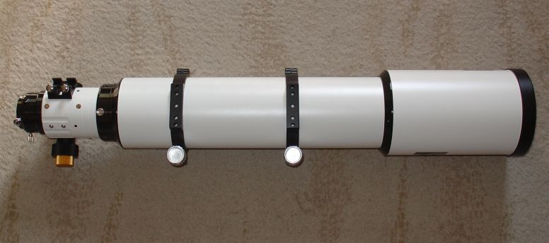 Die Praxis zeigt, wenn man die Taukappe voll einfahren will, muss man die Rohrschellen etwas zurücksetzen. Für die perfekte Balance braucht man sie etwas weiter vorne. Wahnsinnig kopflastig ist dieser Triplet APO nicht, er ist mit etwa 6.5 kg auch noch eher ein Leichtgewicht. Kommt freilich noch der Sucher dazu, und je nach Anwendungsfall entweder ein 2" Zenitspiegel mit Okular oder eben eine Kamera mit Flattener bzw. Reducer. Ob am Sucher das Okular dran ist oder die Guider Kamera, spielt wenig Rolle.