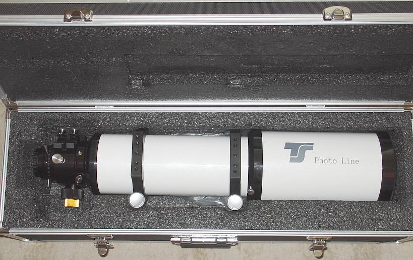 Der 115/800 Triplet APO in seinem Koffer. Die Taukappe ist klarerweise eingezogen. Der auf dem Fokussierer applizierte Sucherschuh gehört nicht zum Lieferumfang.