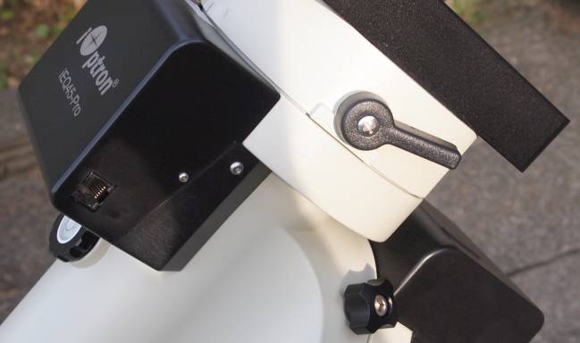 Hier sieht man die neuen Motorgehäuse, den Klemmhebel für die Dec Achse, zwei der vier Sterngriffe für die Klemmung der RA Achse.Die Gegengewichtsstange (28 mm Durchmesser) wird bei der ieq45 seit jeher so verstaut, dass man sie von oben durch den Sattel steckt und einschraubt.