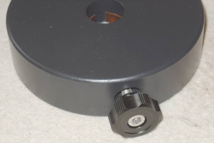 Das neue 5 kg Gegengewicht, 2 Stück sind im Lieferumfang dabei. Man sieht hier, die Sterngriffschraube hat einen Innensechskant-Einsatz. Einst drückte diese Schraube auf einen Stift, der wiederum direkt auf die Gegengewichtsstange gedrückt hat. Z.B. hat die Gegengewichtsstange meiner alten ieq45 schon zahlreiche "Marken". Nun ist ein Messing-Klemmring eingesetzt, der die Gegengewichtsstange beim Klemmen umfasst. Für schwerere Teleskope gibt es noch ein 10 kg Gegengewicht, ebenso ausgeführt, aber weiß lackiert. Falls das noch nicht ausreicht, ist auch eine Verlängerung für die Gegengewichtsstange erhältlich. Eines ist aber immer so: Mehr Gewicht am kurzen Hebel ist besser als weniger Gewicht am längeren Hebel.