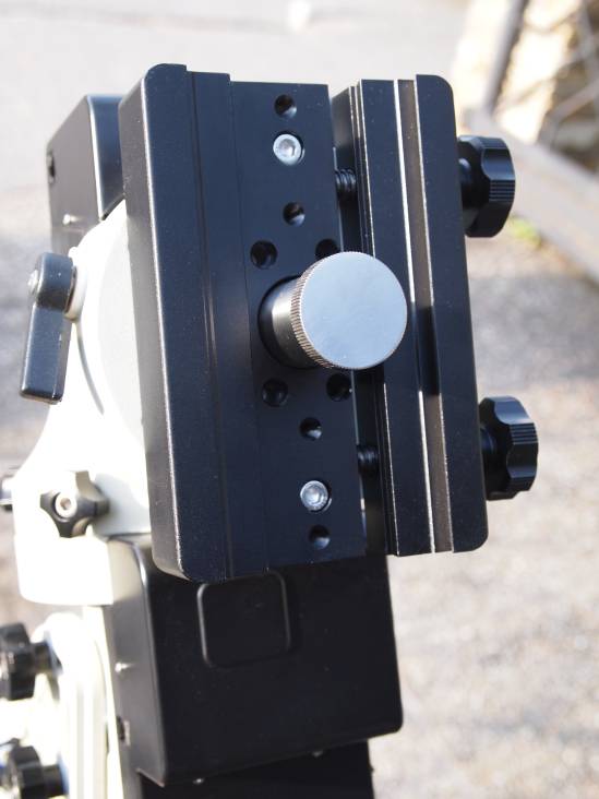 Die Kombi-Klemme für 2" und 3" Prismenschienen. Alle Sterngriffe an der Montierung haben einen Innensechskant Einsatz, können also mit einem Inbusschlüssel nachgezogen werden. Gerade bei der Klemme eine gute Sache. Im Winter mit klammen Fingern kann es sein, dass man die Sterngriffe kaum noch lösen kann.