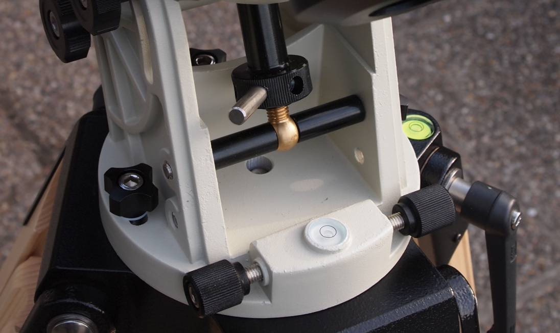 Ein Blick auf den Polblock mit den Einstellungen für Azimut und Höhe. Die Az-Stellschrauben sind keine Besonderheit, man findet sie so an vielen Montierungen. Anders hingegen die Einstellung der Polhöhe. Die Abstützachse für die Höheneinstellung muss für unsere Breiten auf die höhere Position gesetzt werden. Der Hebel zum drehen des Rändelgriffs kann in verschiedenen Positionen eingeschraubt werden. Wenn die Montierung mit Teleskop und Gegengewichten beladen ist, kommt schon ganz schön Druck drauf. Dann könnte man diesen Griff ohne den Hebel nicht mehr drehen. Natürlich knickt diese Konstruktion unter Last ein wenig ein. Ich erledige erst immer eine Vorjustierung des Polarsterns im Polsucher, drehe die Polhöhe dann ein Stück rauf, um etwa dieses Stück sackt die Höhe unter Last wieder ab, und ich habe letztlich nur mehr Feinjustage zu machen. Diese, allerdings, am besten erst nachdem das Teleskop balanciert worden ist. Da rüttelt dann niemand mehr herum und die Poljustierung hält. Anmerkung: Die Libelle auf dem aufgeschraubten Deckel, der den Durchgang für den Polsucher freigibt. wird für den Alt-Az Betrieb benötigt.