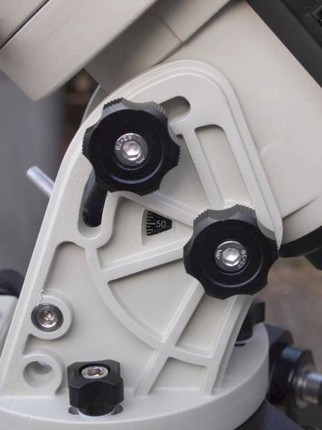 Die Polhöhenstellung kann arretiert werden, dazu gibt es auf der Achse und Backe auf beiden Seiten je einen Sterngriff mit Innensechskant Einsatz. Somit kann hier sogar mit Werkzeug nachgezogen werden. Es hilft der Steifigkeit sehr. In dem kleinen Dreieck zwischen den Sterngriffen versteckt sich die Skala für die Polhöhe Man braucht sie zur Voreinstellung, den Rest erledigt man via Polsucher.