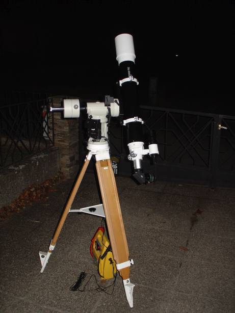 Bei den Kometenfotos (41P/Tuttle-Giacobini-Kresák) versuchten wir es erst nochmals mit dem Originalstativ. Die Sterngriffe an den Stativbeinen so fest wie nur geht zu klemmen, hat nicht funktioniert, so wurde schnell auf mein Baader Holzstativ umgerüstet. Letzteres hatte ich auch beim expliziten Fototest in Verwendung.