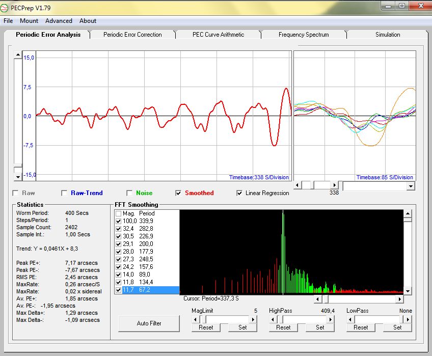 Es kommt immer anders als man denkt. Hier sehen wir im Frequenzspektrum von links langperiodische Terms, wie sie für jede Montierung typisch sind. Diese Terms habe ich mittels Hochpass gefiltert, weil dieser Fehler kommt langsam, nimmt quasi den gesamten PE Verlauf "mit". Was der Guider tatsächlich bewältigen muss, mit ein bissl was dazu oder weg, ist das eben gefilterte Ergebnis. Die größte Magnitude kommt von der Schnecke selbst, so ist das normal. Danach folgt aber ein ganzer "Wald" an Perioden mit höherer Frequenz, die den PE Verlauf interessant machen. Ganz rechts ist das hochfrequente Seeing Gezappel, gefiltert.