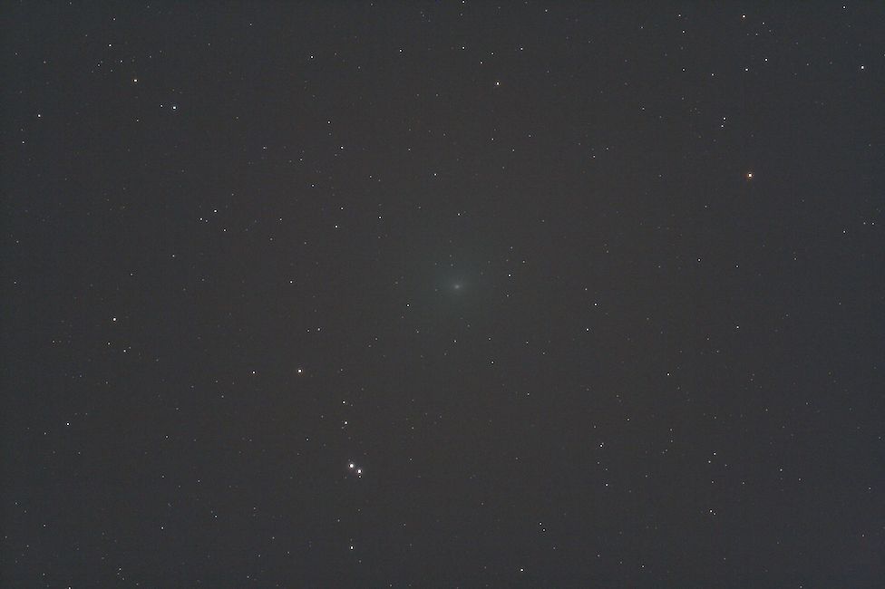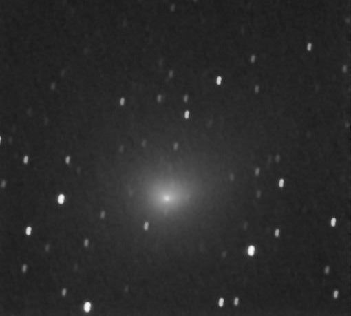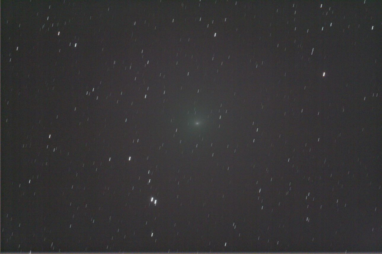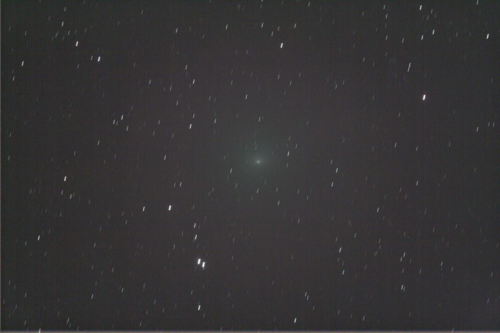 Am 28. März stand ich sowieso draußen, zwecks Testarbeit (die neue iOptron ieq45 Pro), da war es nur ein Handgriff zum 20x80 Glas. Der Himmel war etwas dunstiger, die Sichtung somit schwieriger. Sonst bot der Komet den gleichen Eindruck wie am Vortag. Auffallend war, wie schnell der Komet wandert. Gegen letzten Abend ein ordentliches Stück... Wir, das sind Andi Berthold, der mich beim Test unterstützte, und ich, begutachteten den Komet auch im 102/700 Triplet APO bei 26x. Irgendwie ein "Hauch von Nichts", eine sehr flache Helligkeitsverteilung, schwach, realtiv groß, ein schwacher, dickerer "Stern" als Kern. Sensationell ist anders. Da meine SBIG ST-402 CCD Kamera gerade zwecks Erstellung eines Tracking Protokolls am APO dran war, haben wir unguided ein bisschen gespielt, und dabei fünf Aufnahmen zu je einer Minute Belichtung gezogen. Sicher, ein Schweifansatz ist zu erkennen, viel gibt's aber nicht her.